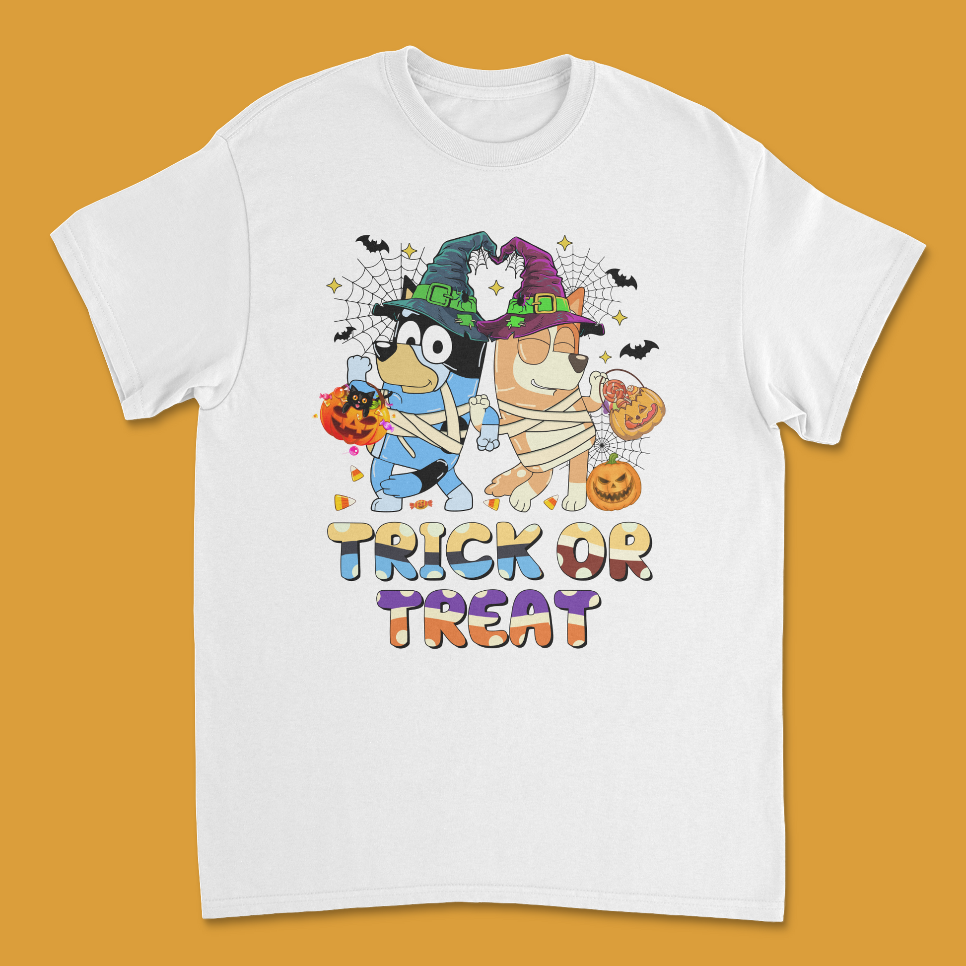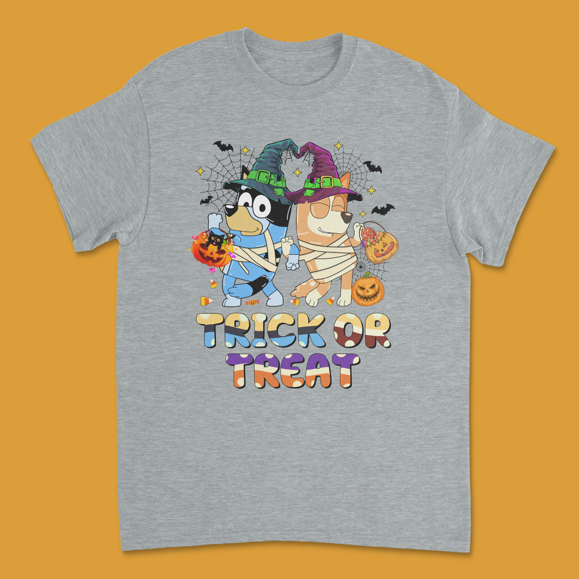 - Bluey Halloween Design: Features Bluey, Bingo, and friends dressed up in Halloween costumes with the phrase "Trick or Treat," making it a fun and festive shirt for the season.