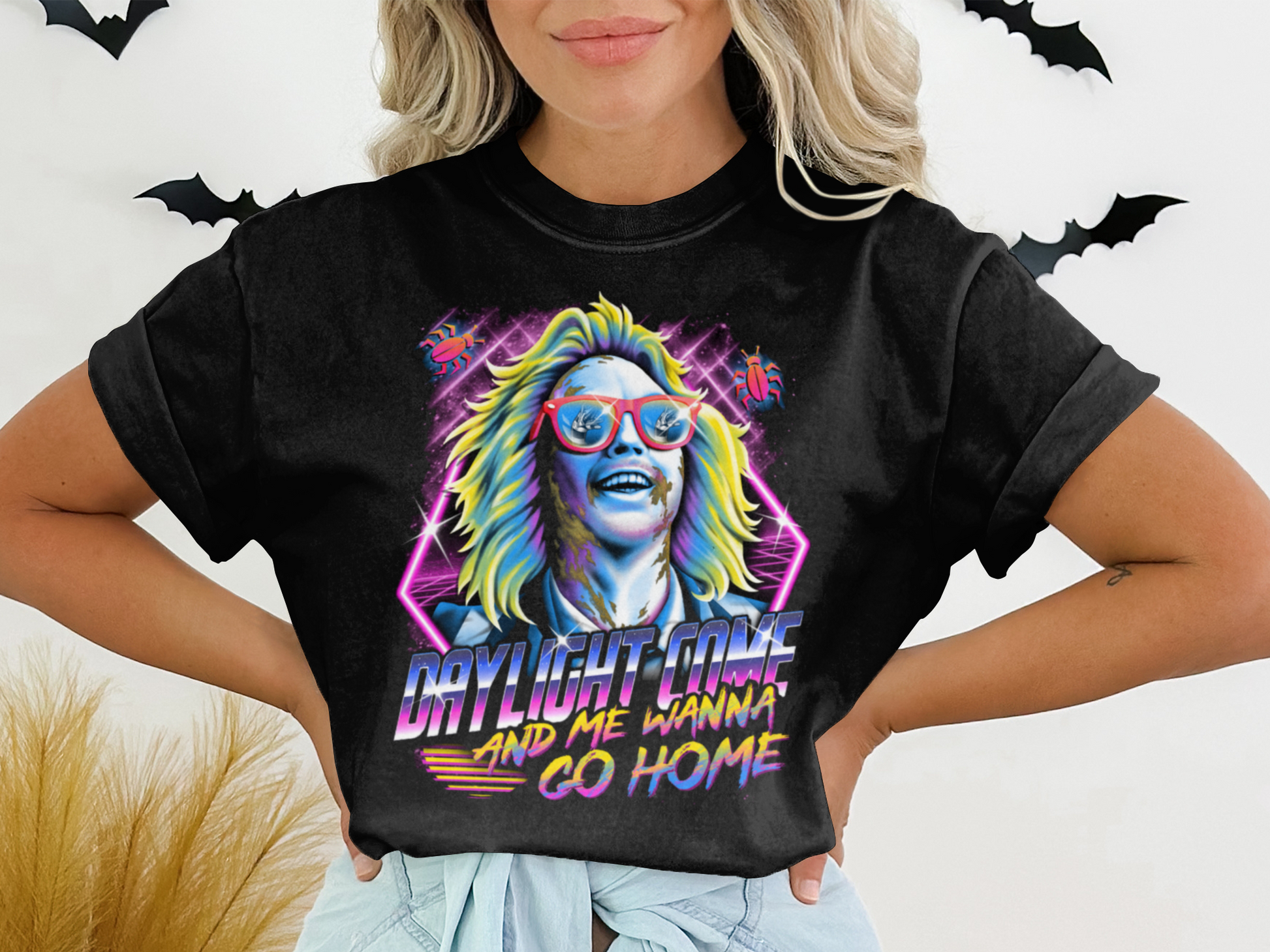 Why You'll Love It: This Beetlejuice shirt is more than just clothing—it's a conversation starter! Ideal for Beetlejuice fans who want to celebrate their favorite scenes, this t-shirt brings the humor and spookiness of the movie to life. The quote "Daylight Come and I Wanna Go Home" captures the essence of the hilarious Day-O scene. Pair it with jeans, a jacket, or even your favorite costume pieces for a complete look!