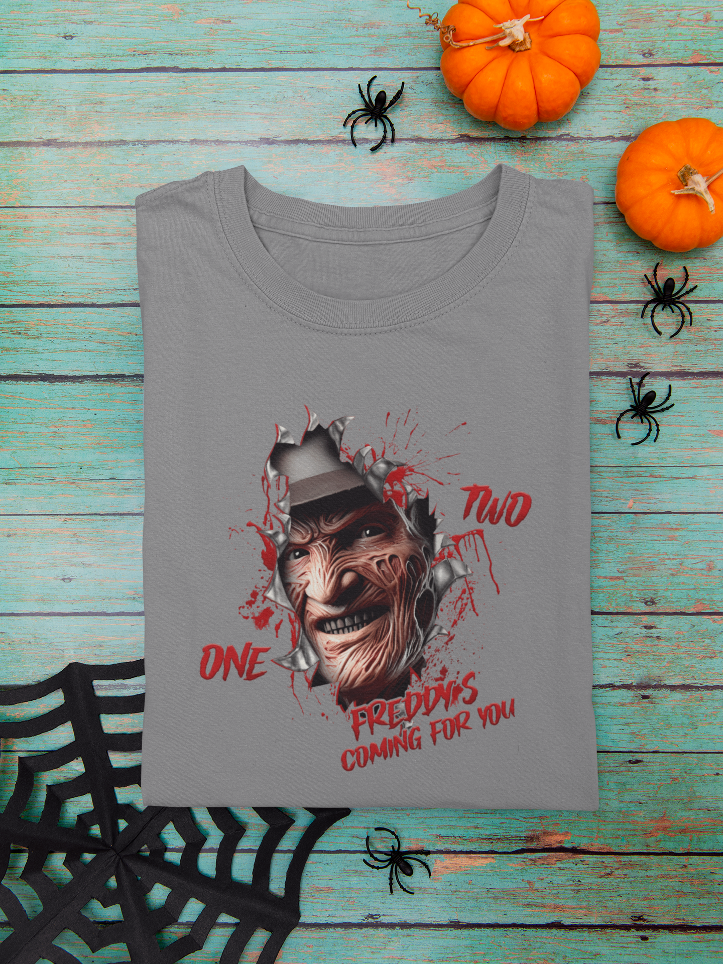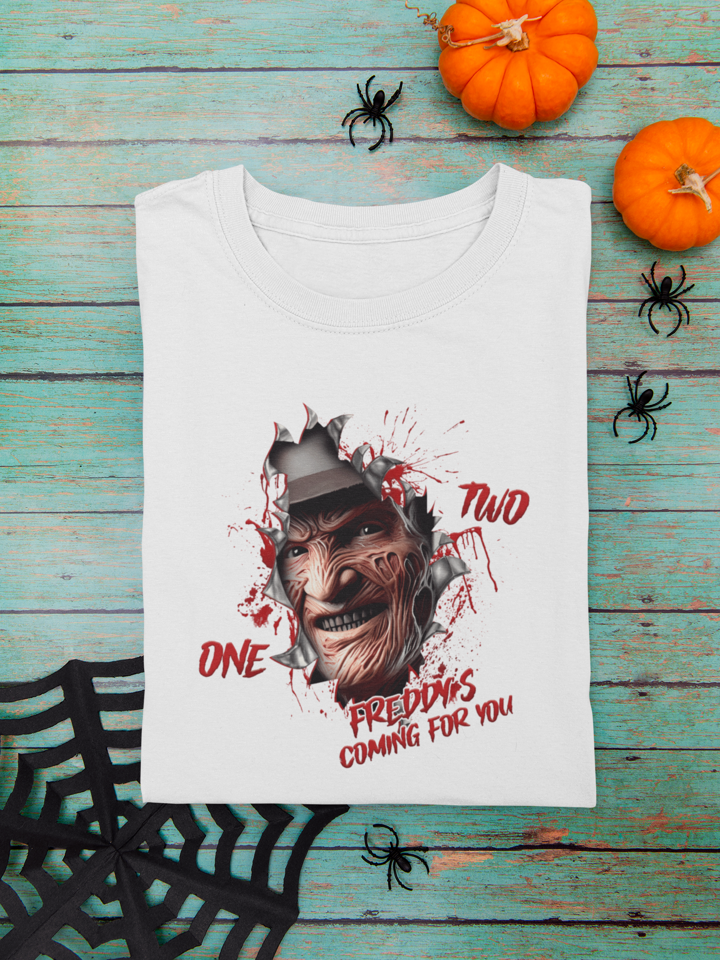 Care Instructions: To keep your One, Two, Freddy’s Coming for You t-shirt looking its best: