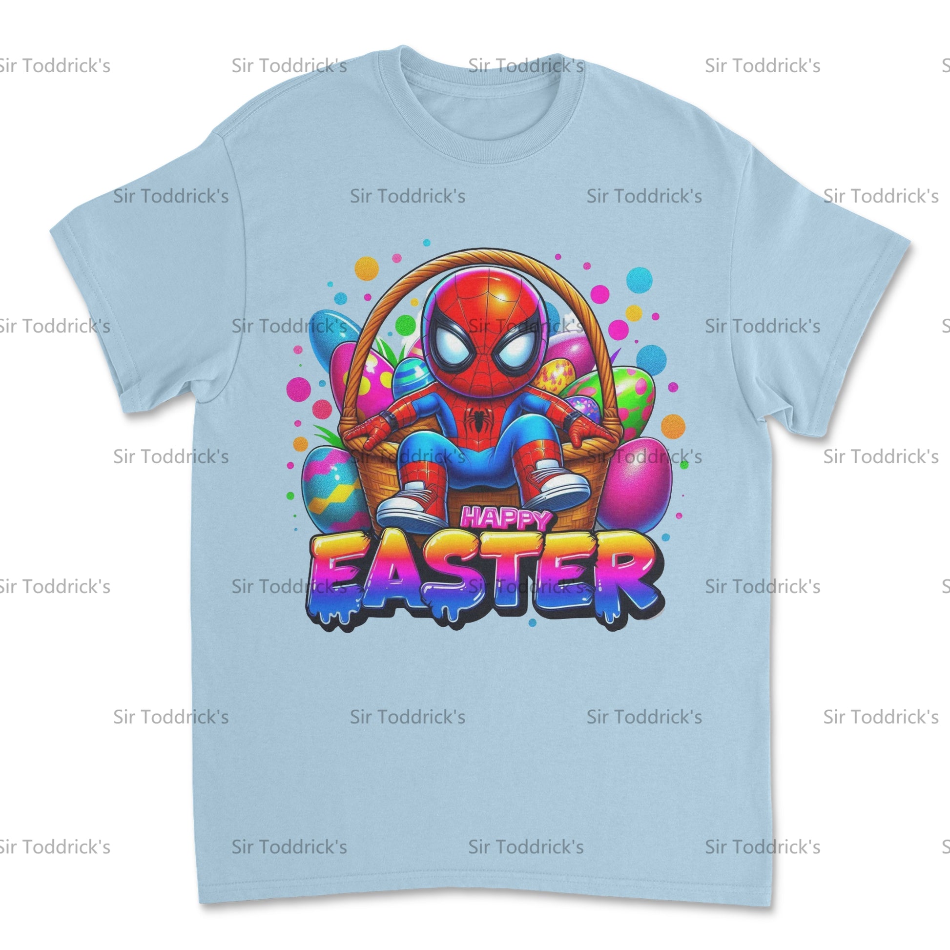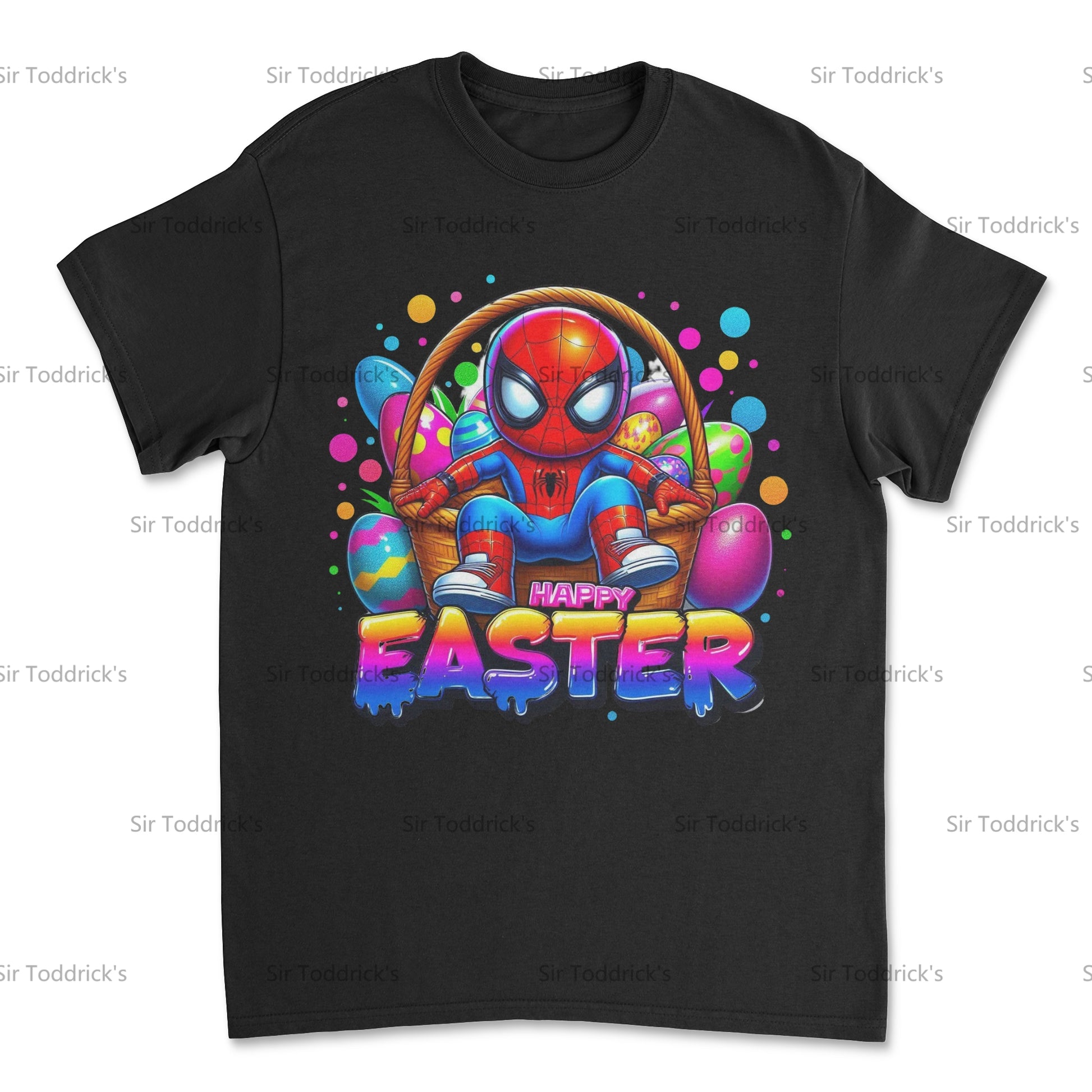 Swing into Easter fun with this Spider-Man-inspired "Happy Easter" tee! Featuring a webbed-up holiday design with Easter eggs wrapped in Spidey-style webbing, bold comic book lettering, and a superhero touch, this shirt is perfect for fans who love both crime-fighting and egg hunting. Whether you're chasing villains or Easter eggs, this tee is the ultimate way to bring some heroic energy to your holiday celebrations. Great for kids, adults, and superhero fans alike!