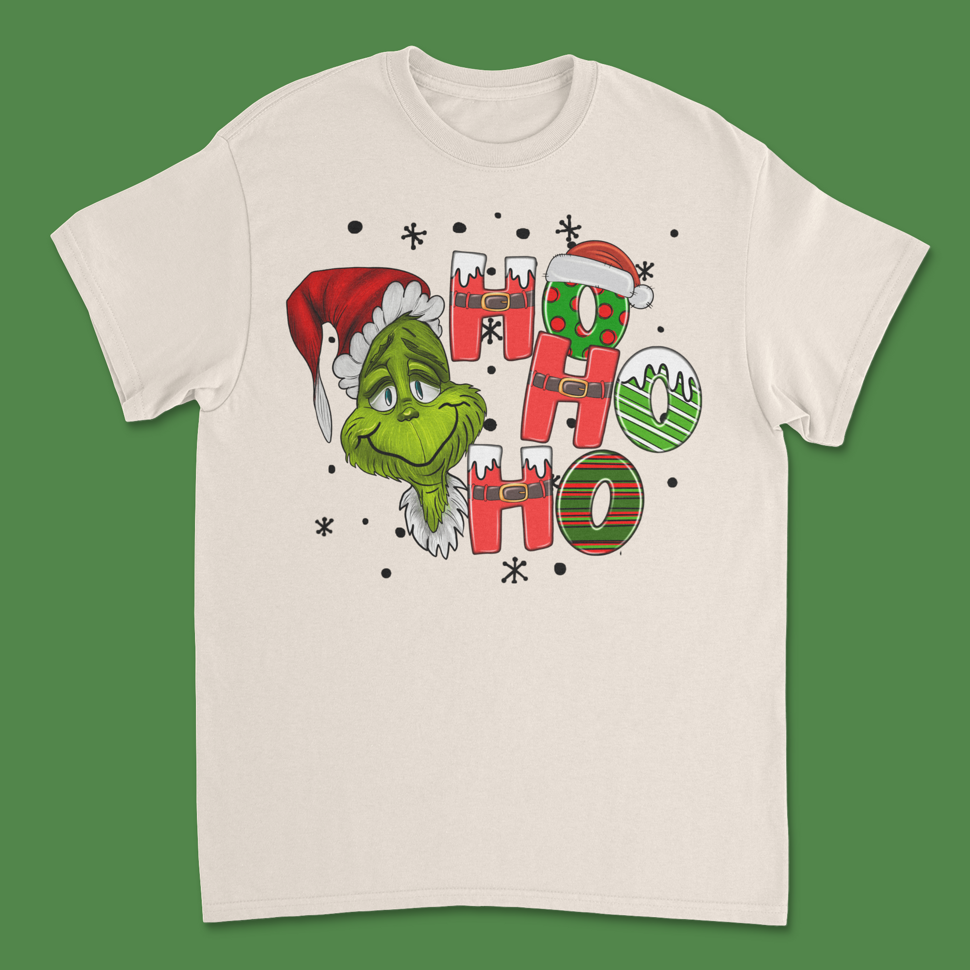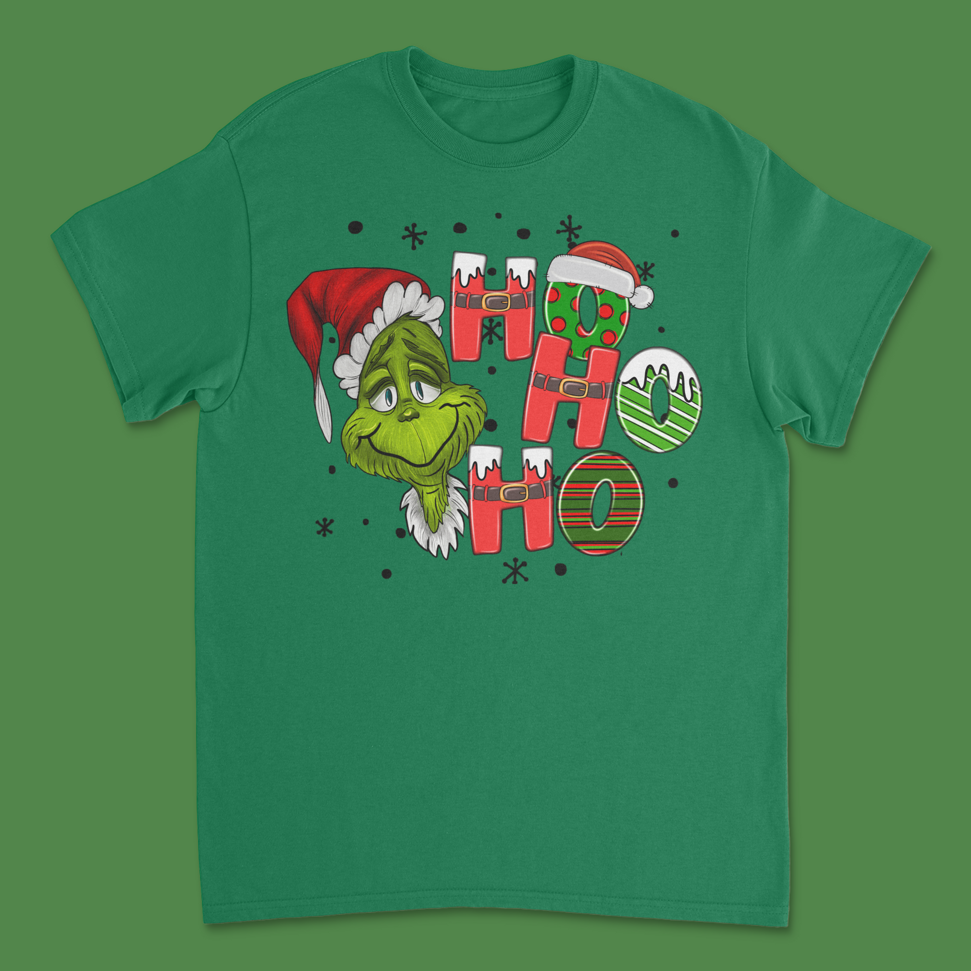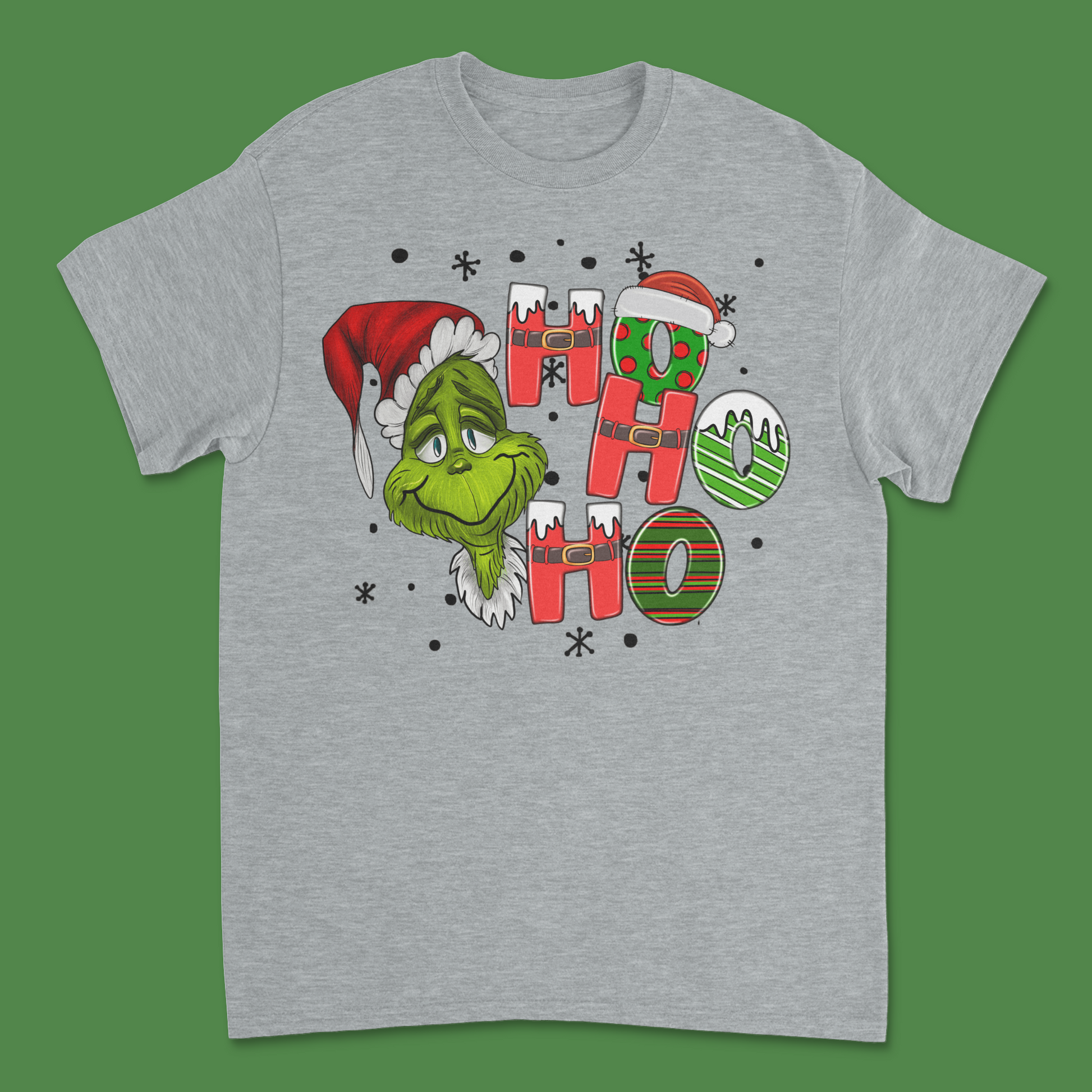 Get ready to spread some cheeky holiday cheer with our Ho Ho Ho Grinch Christmas Shirt! This playful design features everyone’s favorite green grouch dressed up in full Christmas spirit, adding a touch of humor to your festive wardrobe. The bold "Ho Ho Ho" design is adorned with classic Christmas elements, making it perfect for holiday parties, family gatherings, or just embracing the season with a grin (or a Grinchy scowl!).