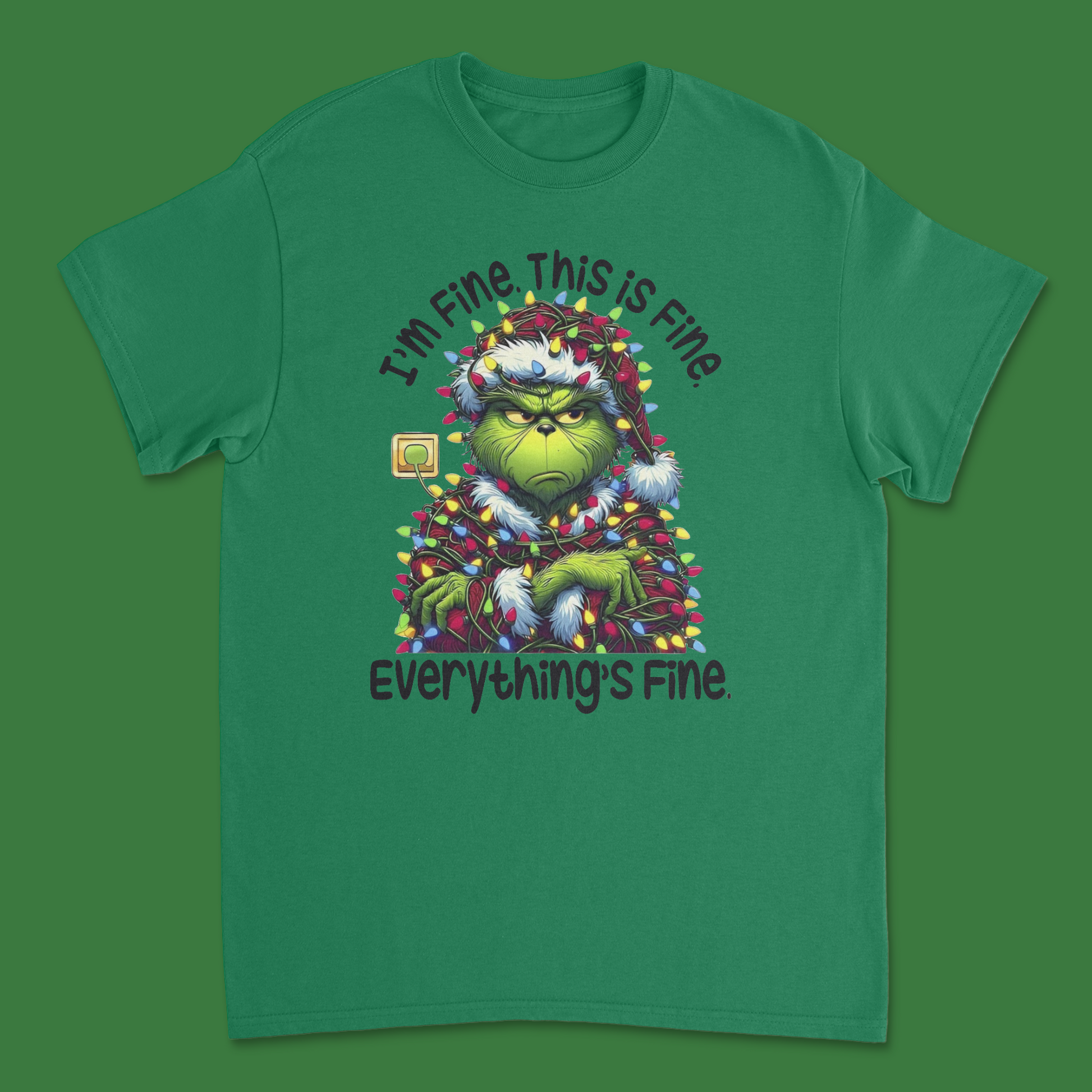Embrace the chaos of the holiday season with a touch of Grinchy humor in our I'm Fine. This is Fine. Everything is Fine Grinch Shirt! Perfect for anyone who feels a little overwhelmed by the holiday hustle and bustle, this hilarious graphic tee features the Grinch looking comically stressed, capturing the relatable holiday mood. Made from soft, high-quality cotton, this shirt ensures all-day comfort, making it ideal for holiday parties, shopping trips, or just relaxing with a cup of cocoa. The vibrant, long-lasting print adds a playful twist to your festive wardrobe, making it a great gift for Grinch fans or anyone with a sense of humor about the holidays.