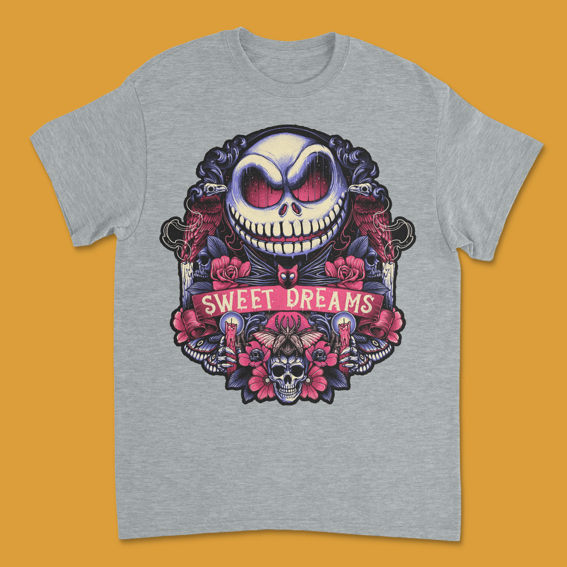 Step into a world of spooky fun and whimsy with our Jack Skellington "Sweet Dreams" T-shirt! Featuring a haunting design inspired by the beloved Pumpkin King from The Nightmare Before Christmas, this tee captures Jack's spooky charm along with the playful phrase "Sweet Dreams." Whether you’re a fan of Halloween, Christmas, or just Jack’s unique style, this shirt is the perfect way to show off your love for this classic character.