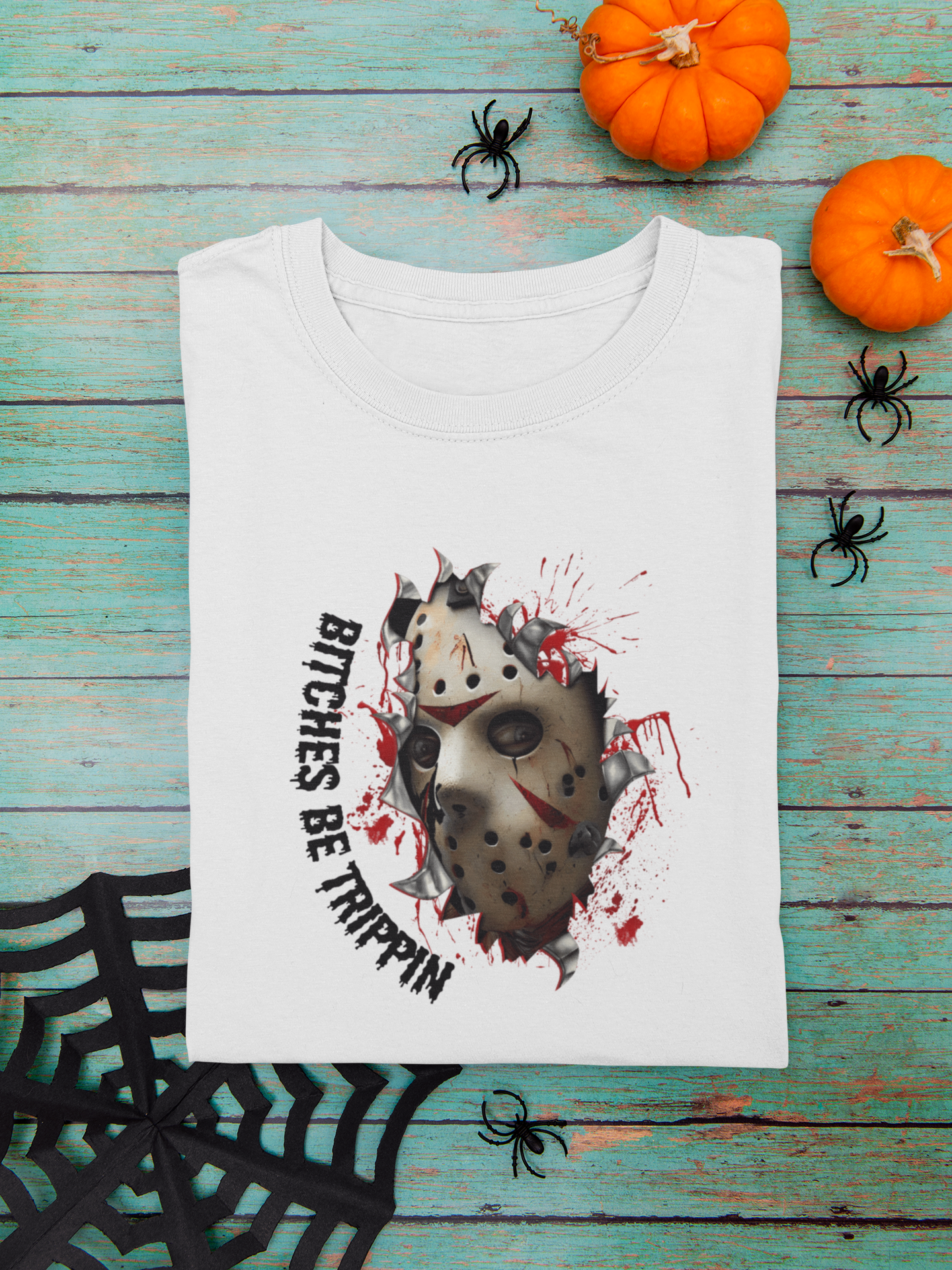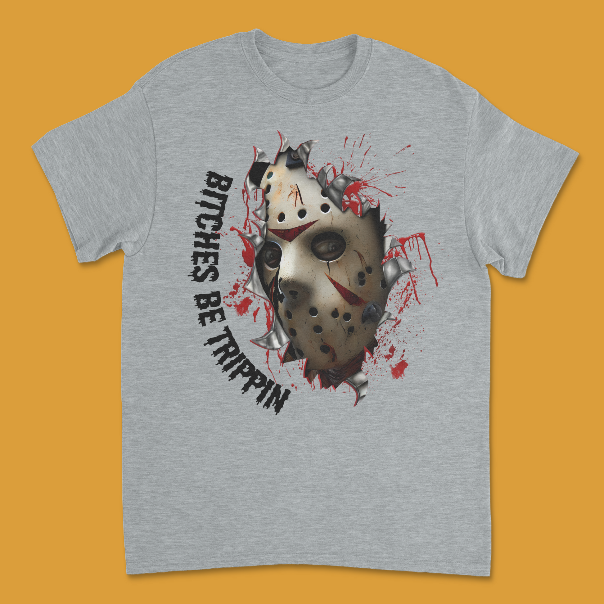 Add a dose of humor to your horror collection with our Jason Voorhees "Bitches Be Trippin" T-shirt! Perfect for fans of Friday the 13th who enjoy a dark sense of humor, this shirt features Jason Voorhees with his iconic hockey mask and the cheeky phrase "Bitches Be Trippin". Whether you're at a Halloween party, horror movie night, or just want to show off your love for classic slashers, this tee is sure to get a few laughs (and scares) from fellow horror fans.