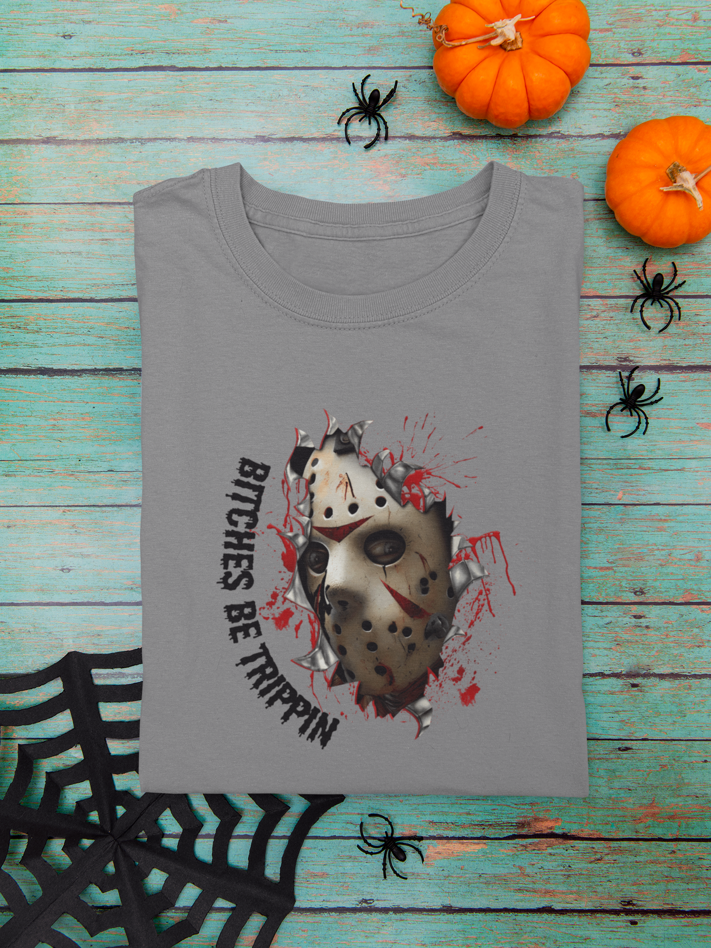 - Dark Humor Design: Features Jason Voorhees in his iconic hockey mask paired with the playful phrase "Bitches Be Trippin", making it perfect for horror fans who appreciate a little humor.