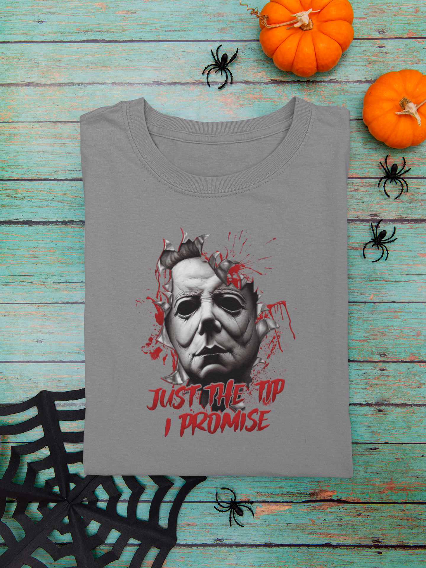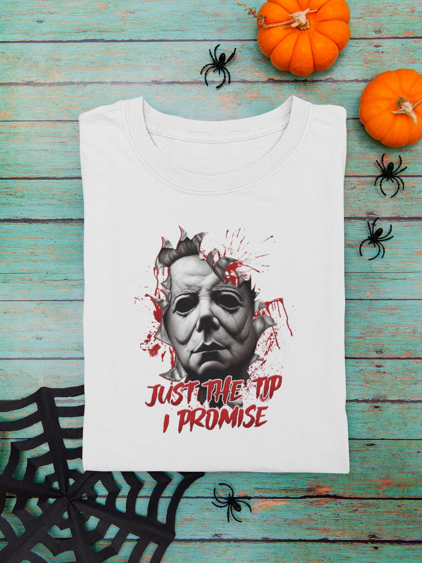 Get ready to bring a wicked sense of humor to your horror wardrobe with our Michael Myers "Just the Tip" T-shirt! Perfect for fans of dark humor and classic slasher films, this tee features a playful yet sinister design of Michael Myers with the cheeky phrase "Just the Tip," making it a hilarious addition to your Halloween attire or any horror-themed event.
