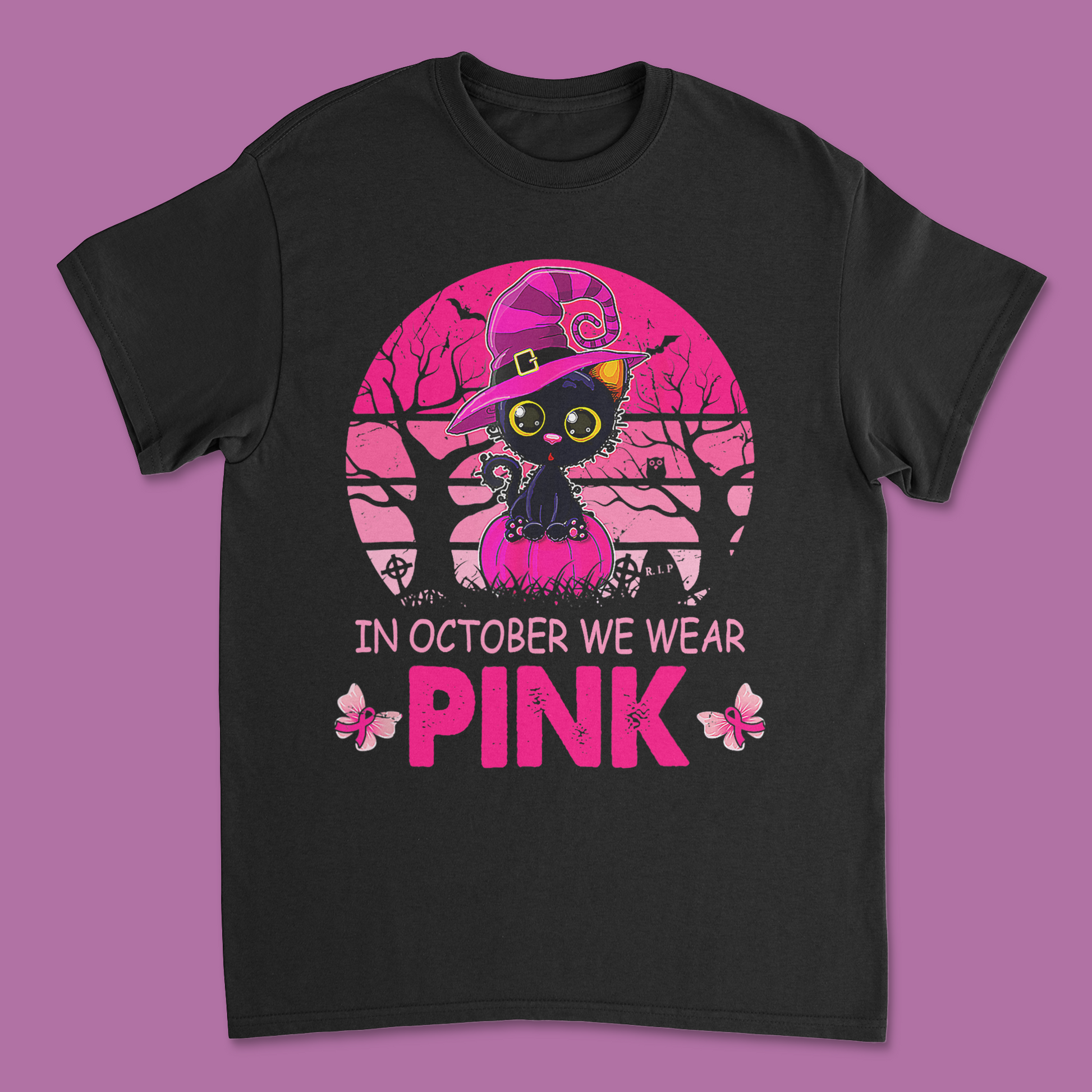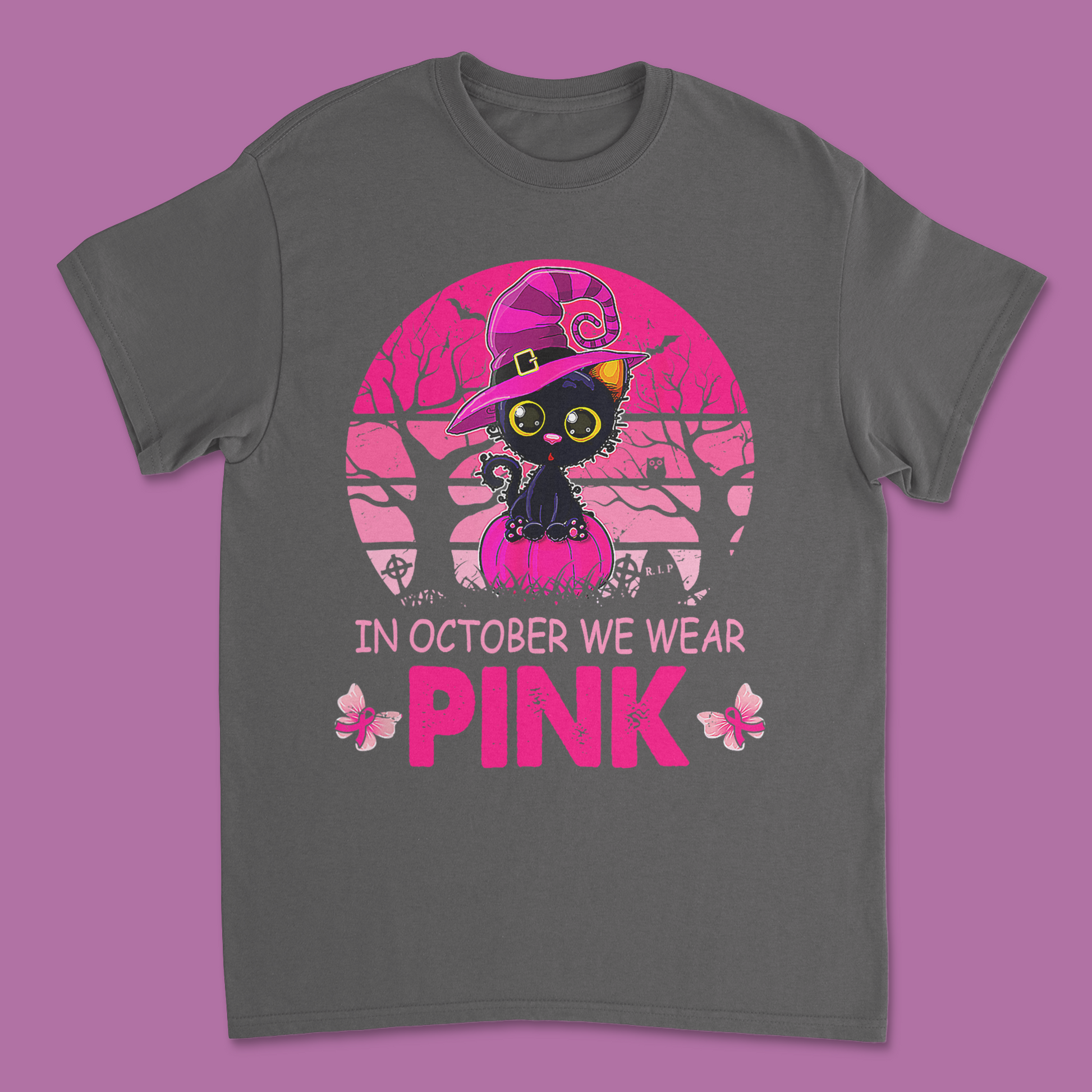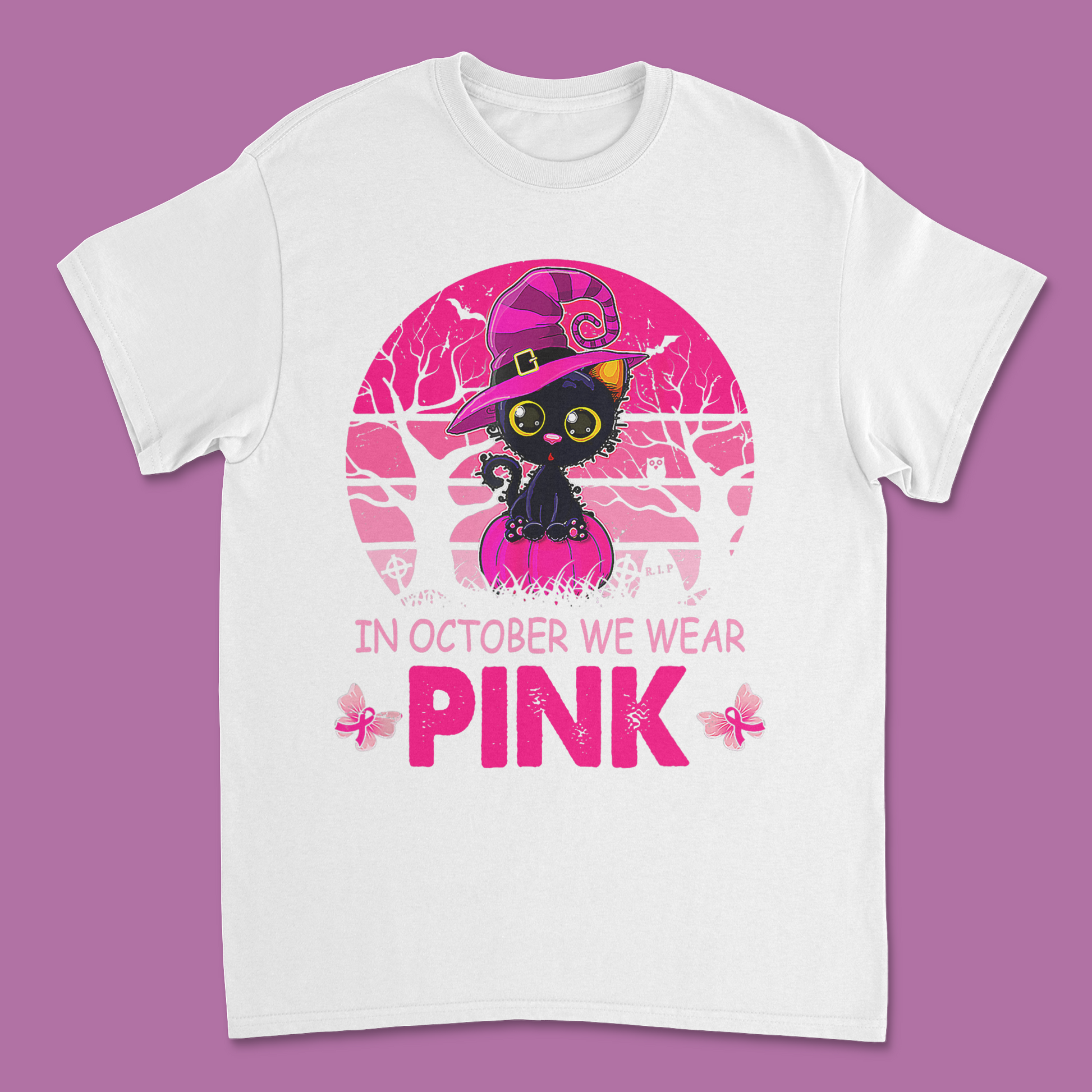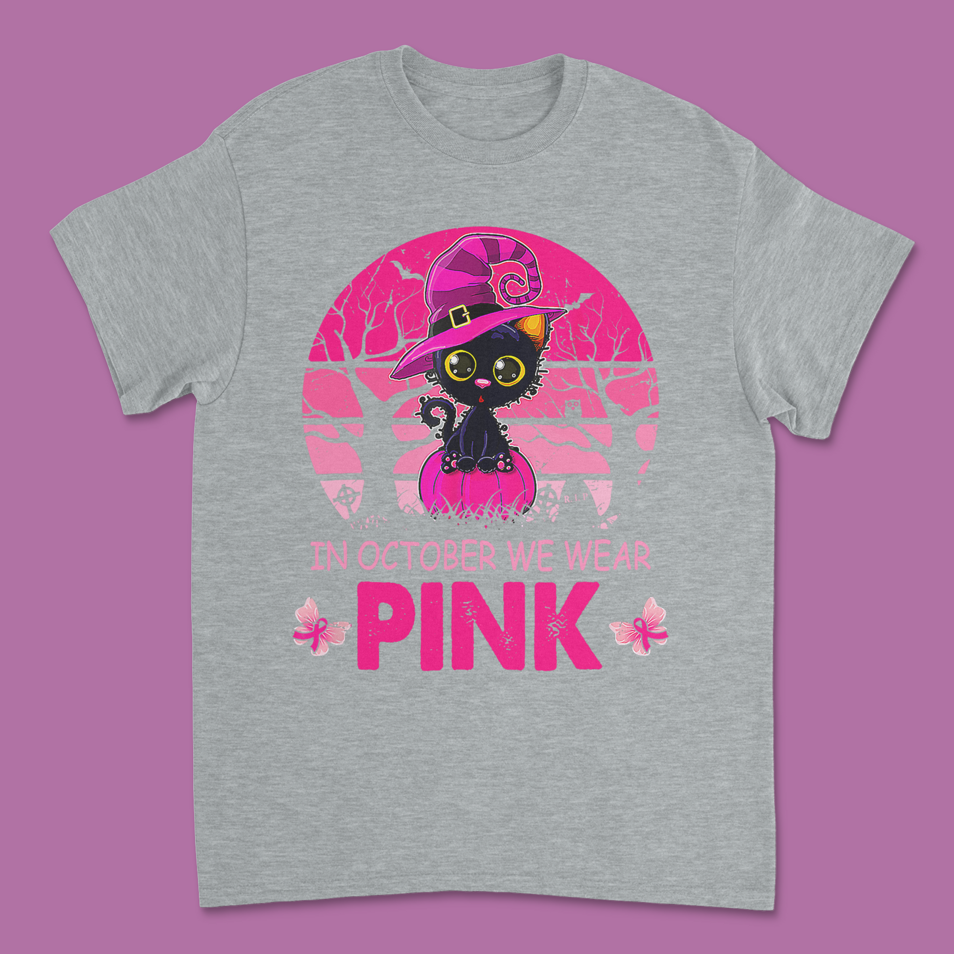 Charming Design: Features a cute cat wearing a witch's hat alongside the empowering phrase "In October, We Wear Pink."