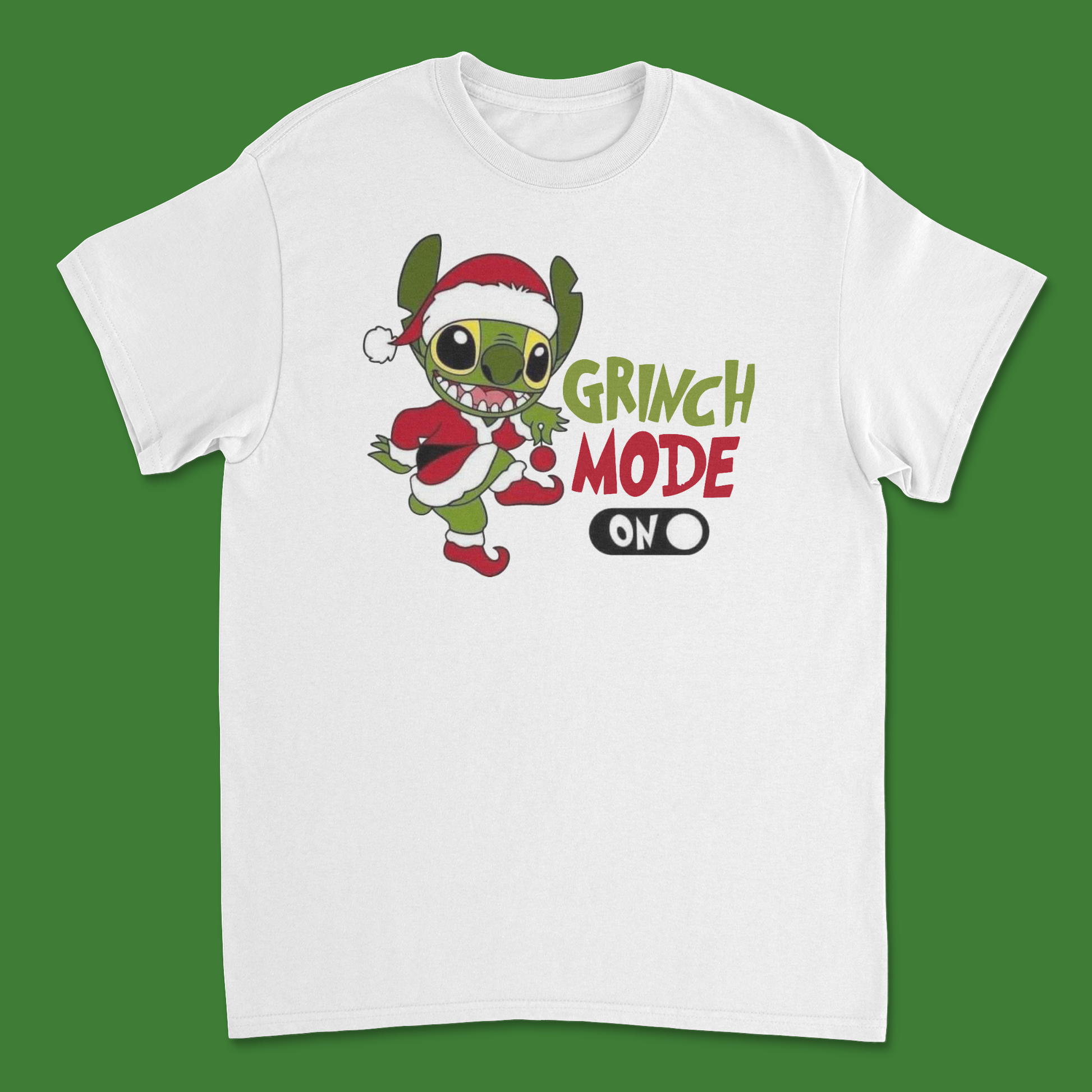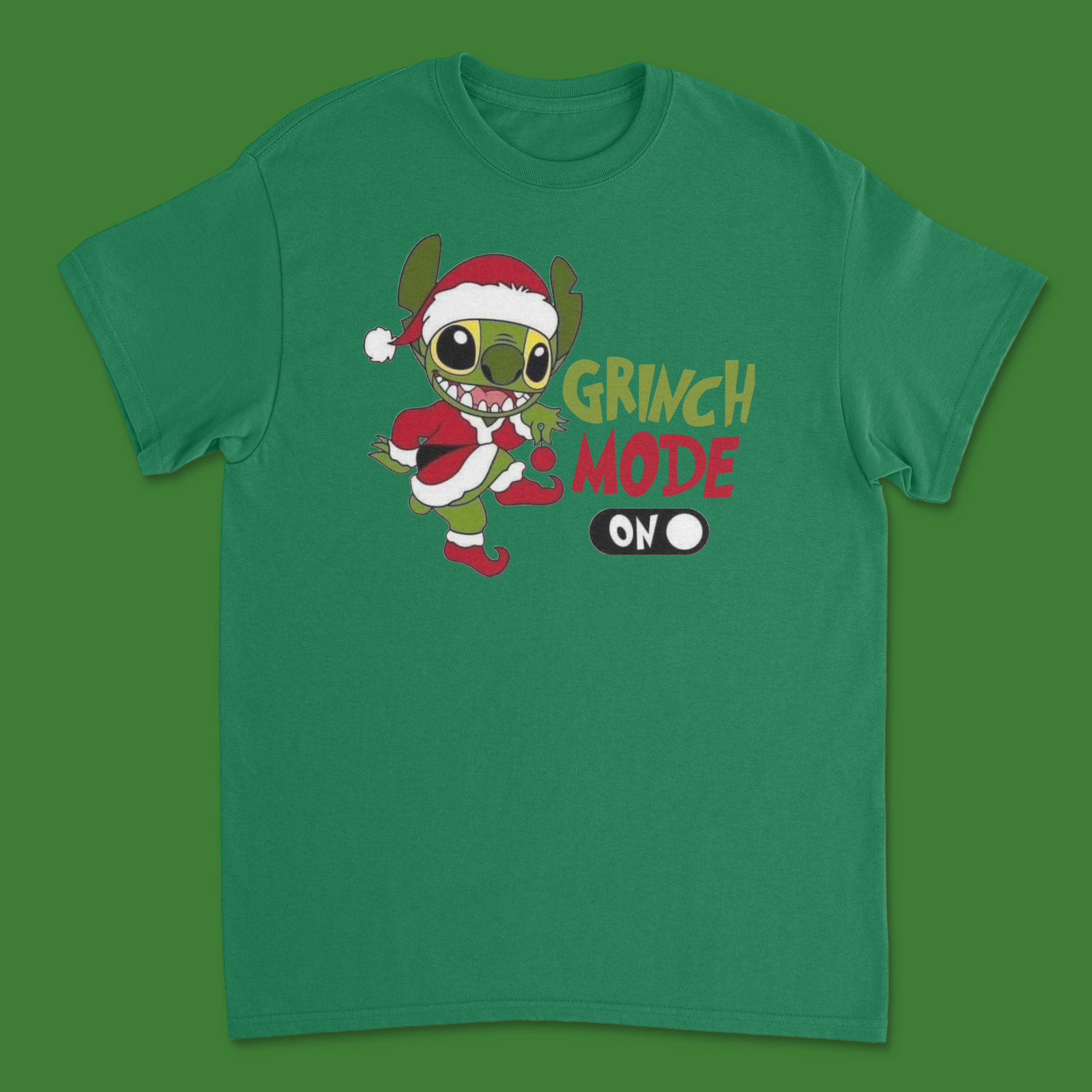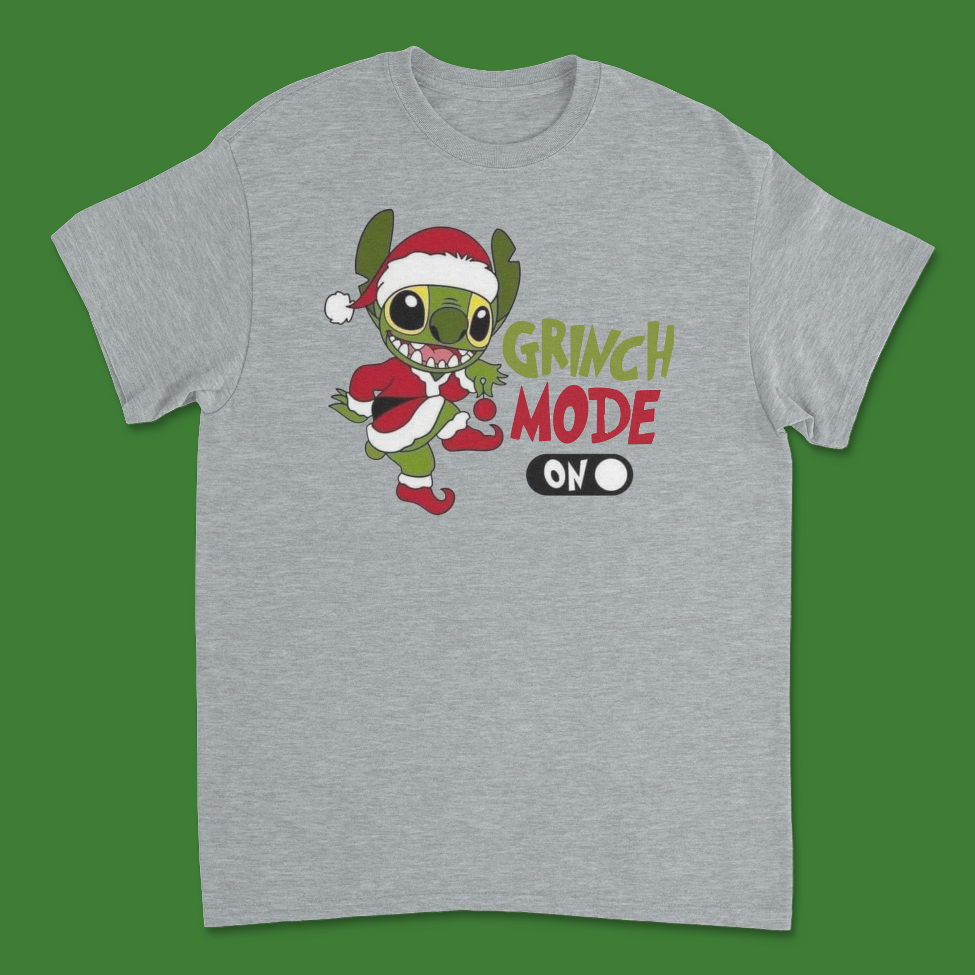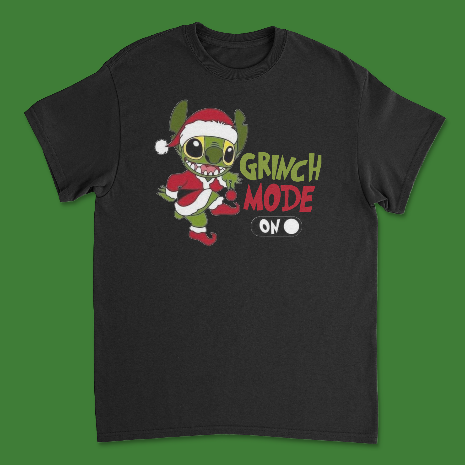 - Unique, fade-resistant graphic design featuring Stitch in Grinch Mode.