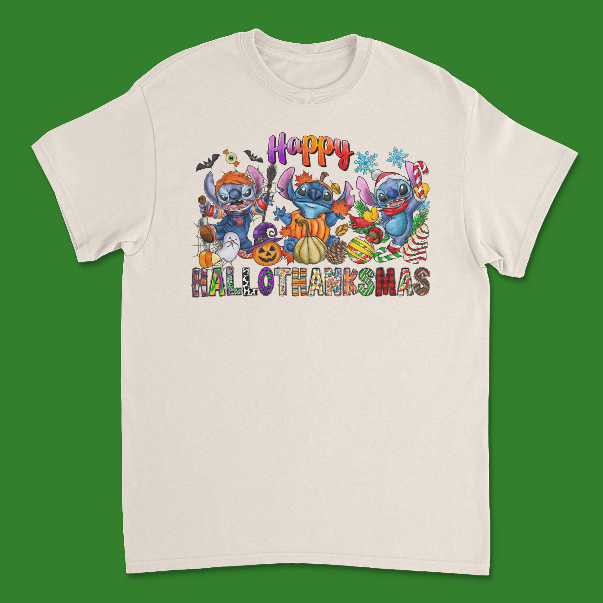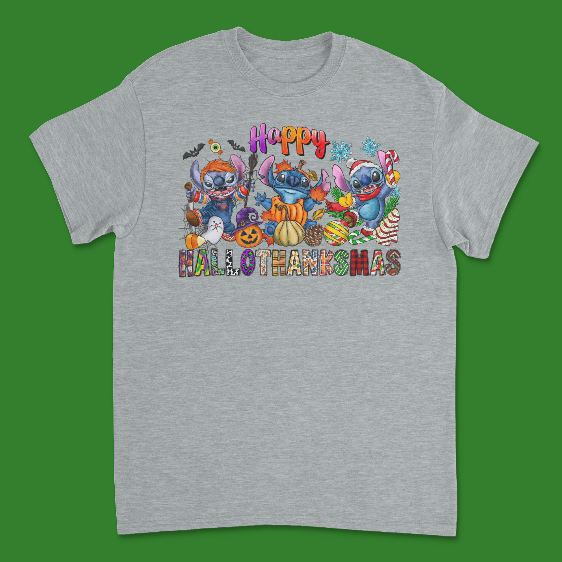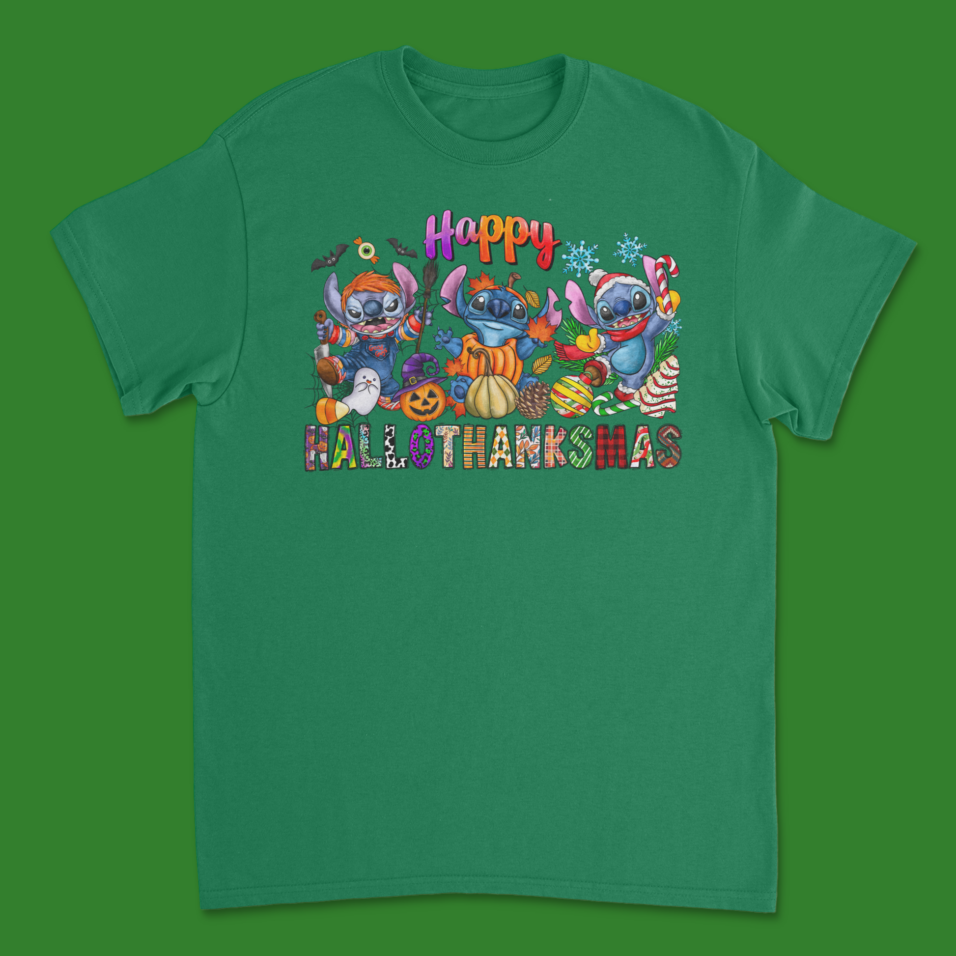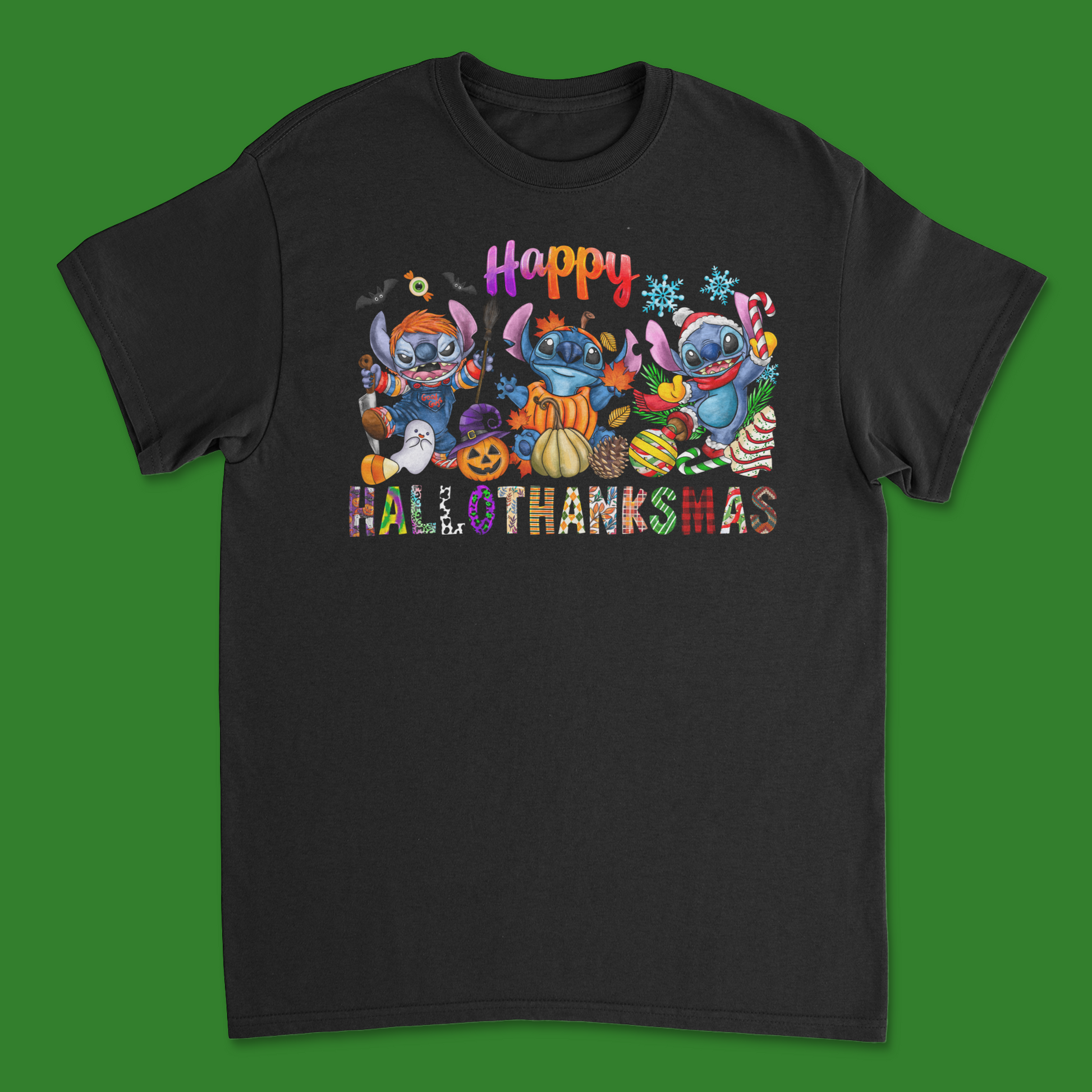 Stitch Hallothanksmas Shirt - Disney-Inspired Tee for Halloween, Thanksgiving & Christmas Fans