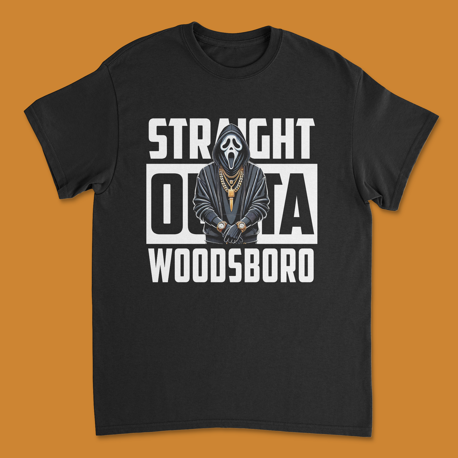 - 'Straight Outta Woodsboro' graphic design for horror movie fans