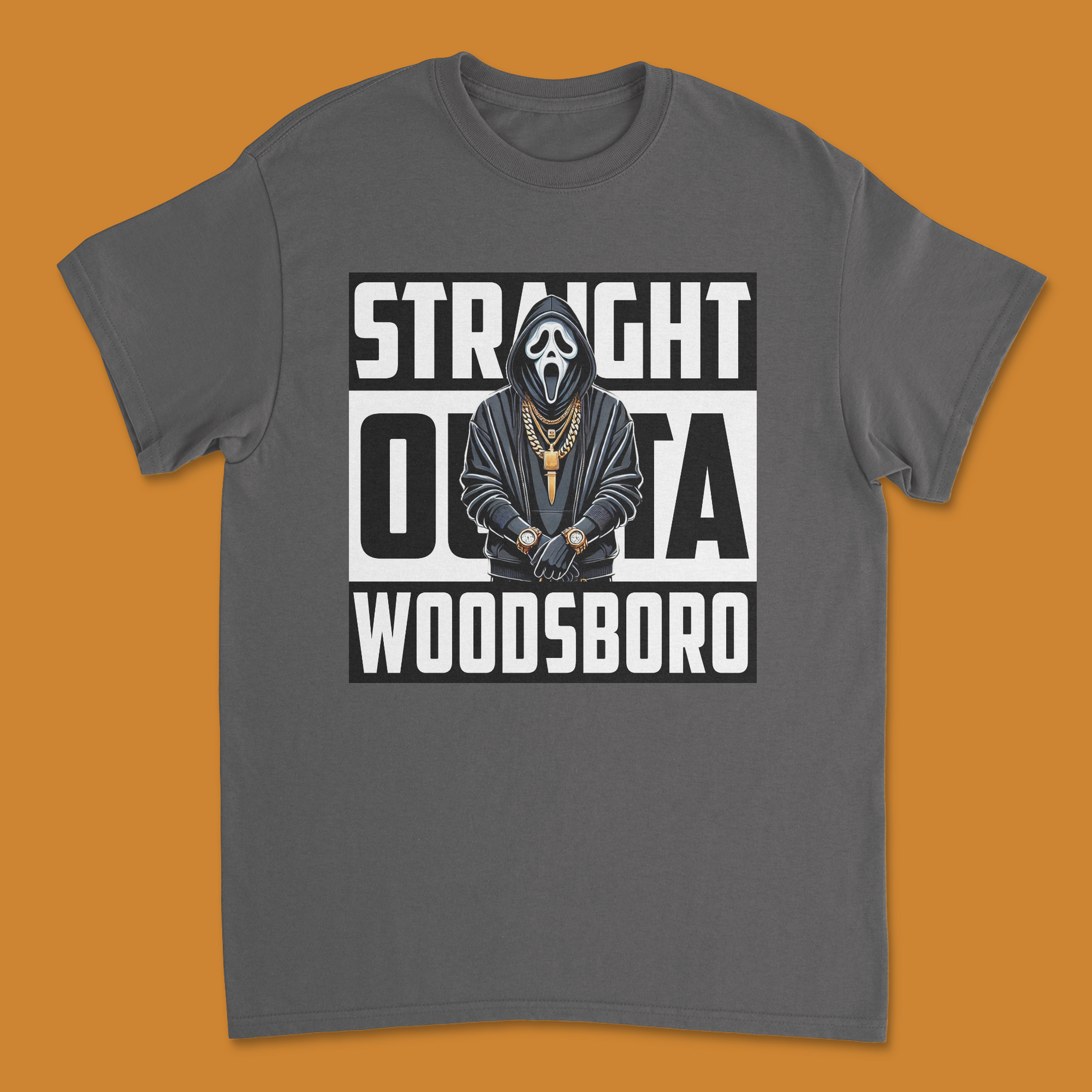 Channel your inner horror fan with our 'Straight Outta Woodsboro' T-Shirt, inspired by the iconic fictional town from your favorite slasher film franchise! Perfect for lovers of classic horror movies, this bold graphic tee is a must-have for anyone who knows the scares and suspense that come with the name Woodsboro. Whether you're heading to a horror movie marathon, a Halloween party, or just want to show off your fandom, this shirt delivers both style and comfort.