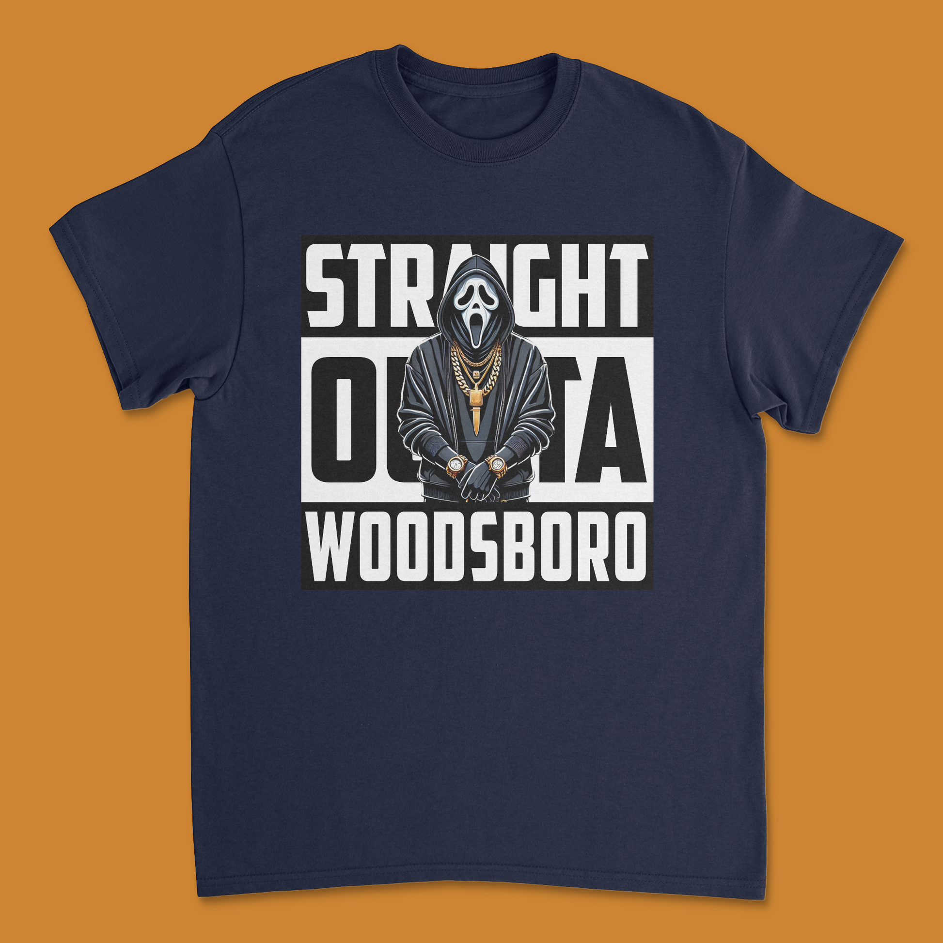 Step up your horror fan gear with this 'Straight Outta Woodsboro' T-shirt and show the world you're ready for some scream-worthy scares! Add it to your cart today and make this spooky season even more thrilling.