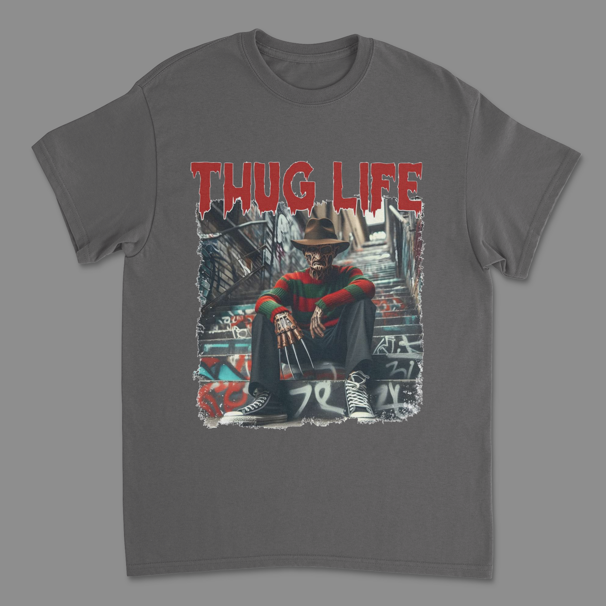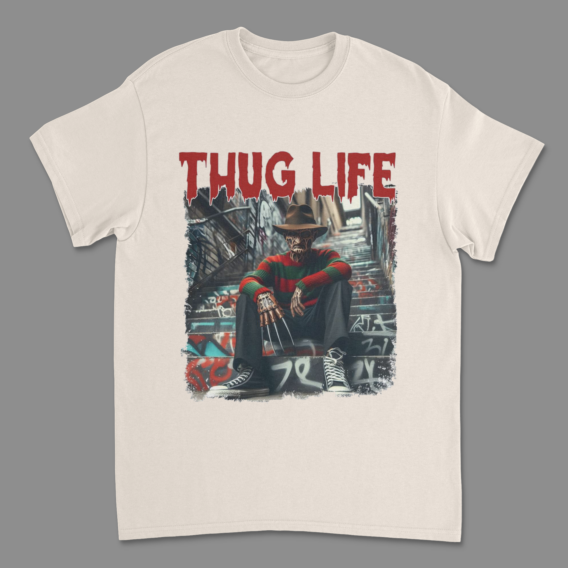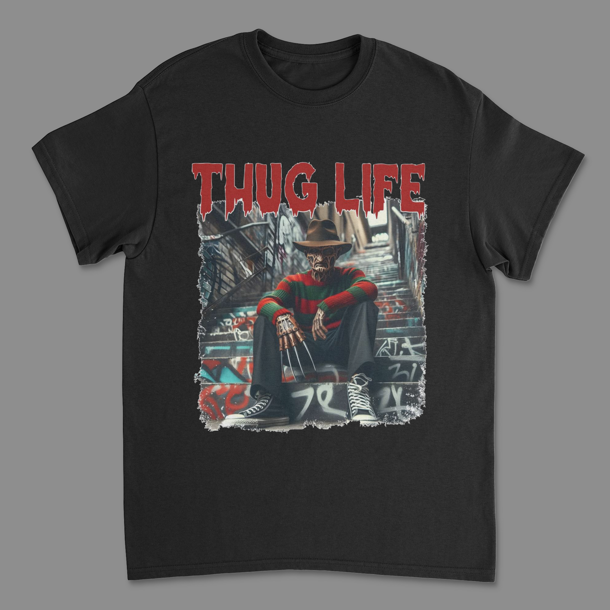 Crafted from premium, soft cotton, this t-shirt ensures all-day comfort while showcasing your love for horror icons and gangster culture. Whether you're a die-hard fan of Freddy, or just looking to make a bold fashion statement, this shirt is guaranteed to turn heads. Ideal for casual wear, parties, or horror conventions, this Freddy Krueger Thug Life T-Shirt is the perfect way to blend your love of iconic horror with urban style.