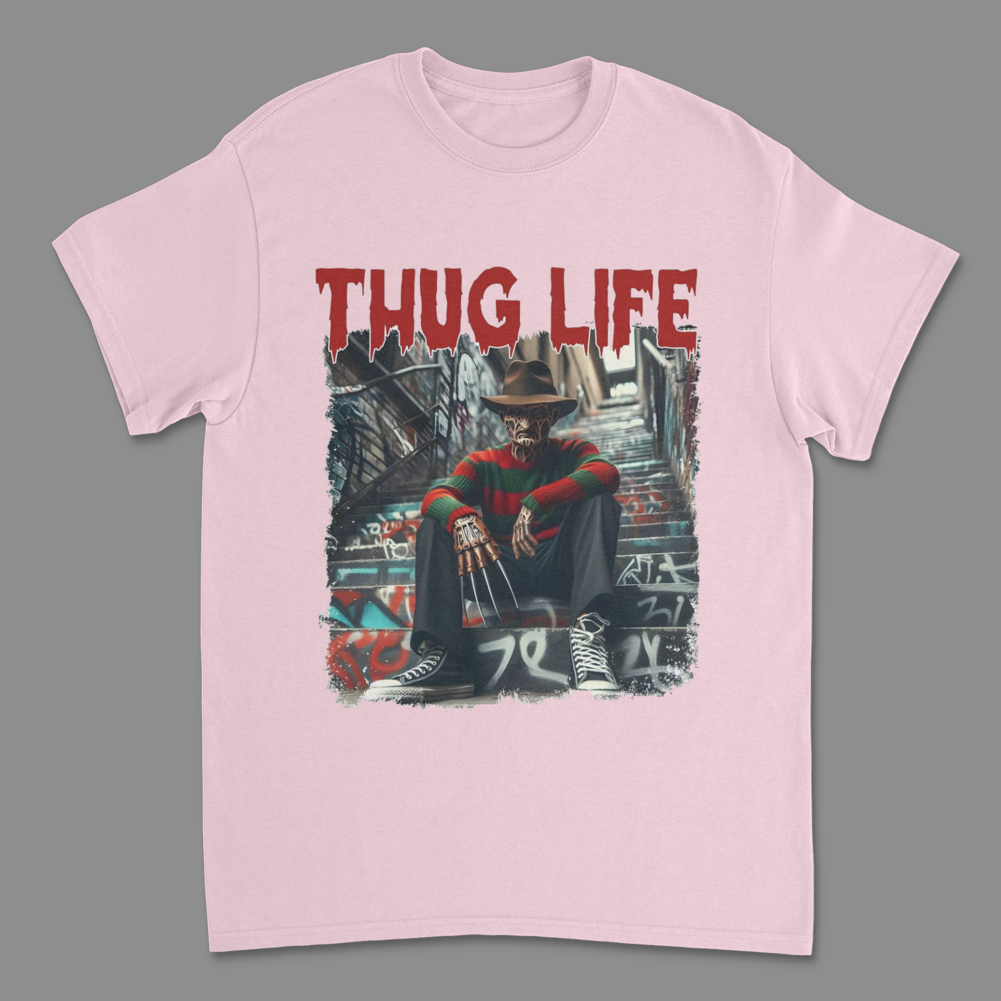 Stand out from the crowd with this bold and badass Freddy Krueger "Thug Life" t-shirt. Whether you're prowling the streets or chilling at home, this shirt lets everyone know you're living the thug life in your nightmares and beyond!