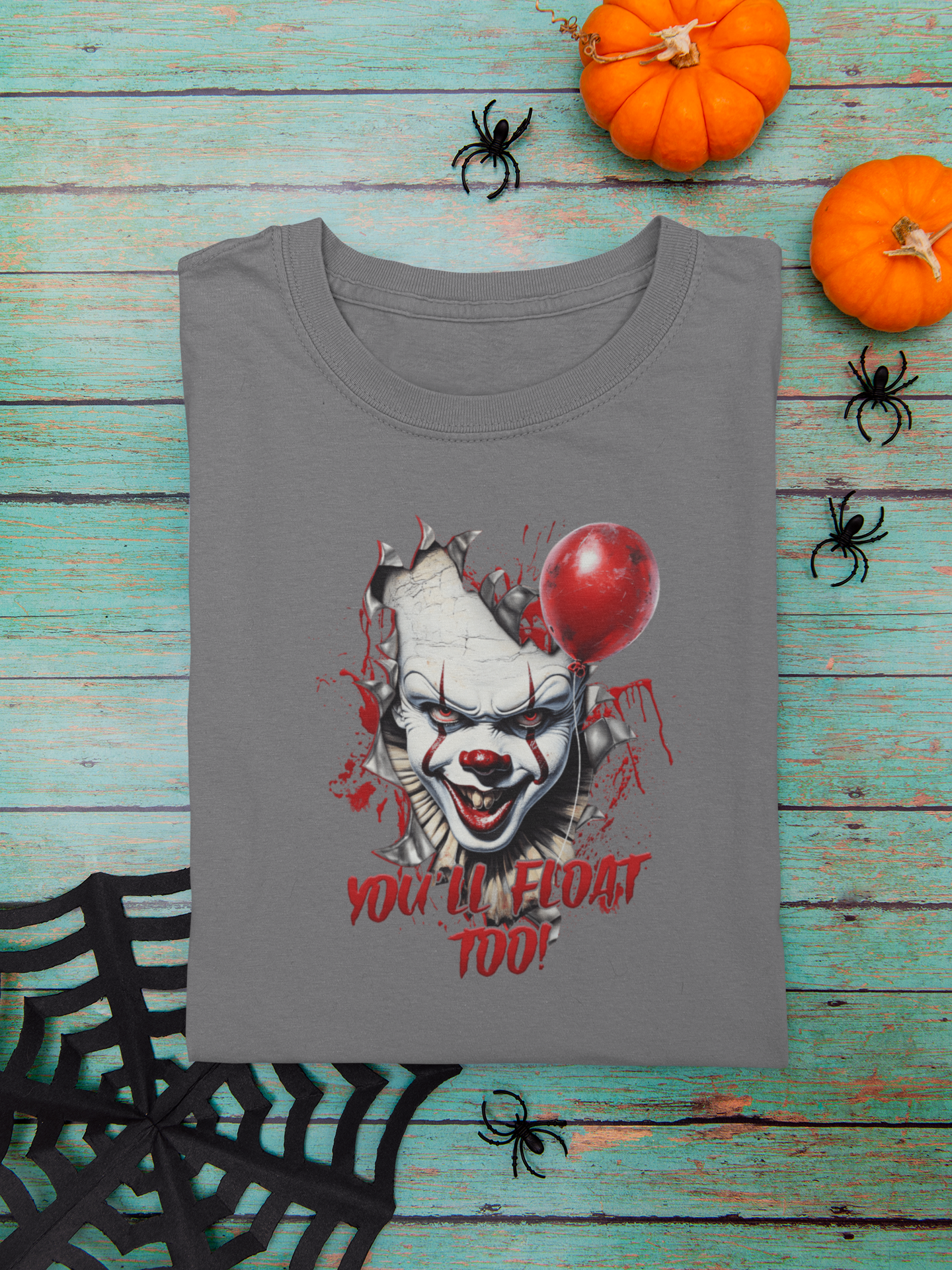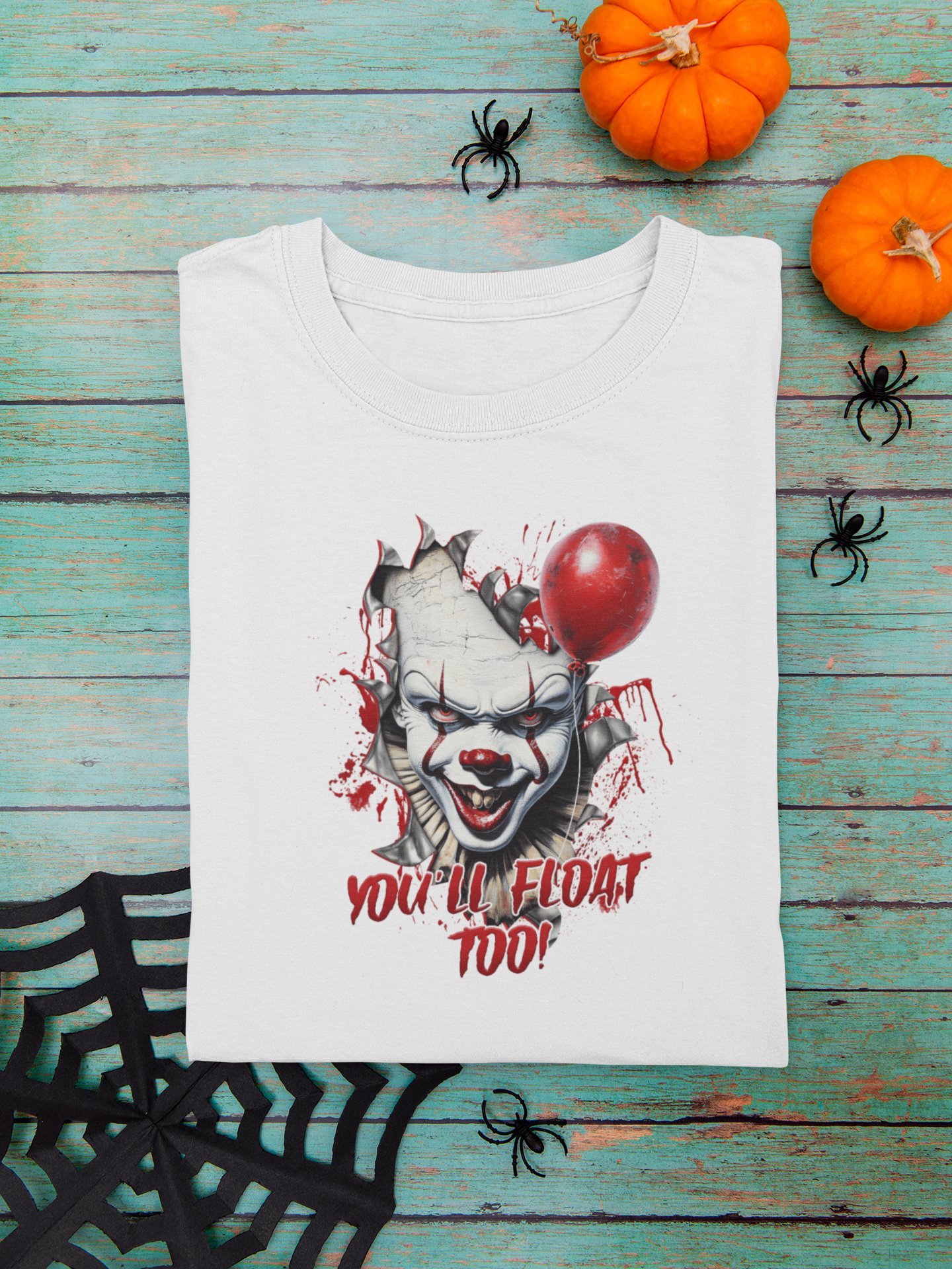 Step into the world of spooky thrills with our "You'll Float Too" Pennywise-inspired Halloween T-shirt! Perfect for horror fans, this eerie shirt pays tribute to one of the most iconic creepy clowns in horror history. Featuring a chilling design with a red balloon and haunting text, this shirt will give everyone a scare while showing your love for Halloween. Whether you’re going to a haunted house, a Halloween party, or just embracing the spooky season, this shirt is perfect for fans of terrifying clowns and classic horror.